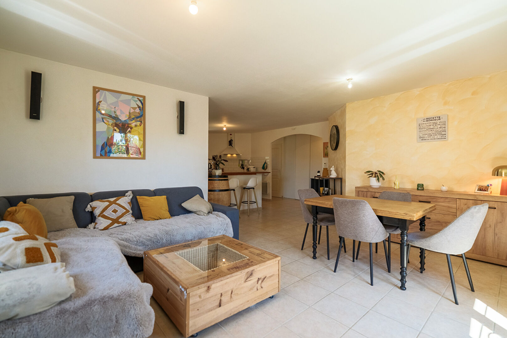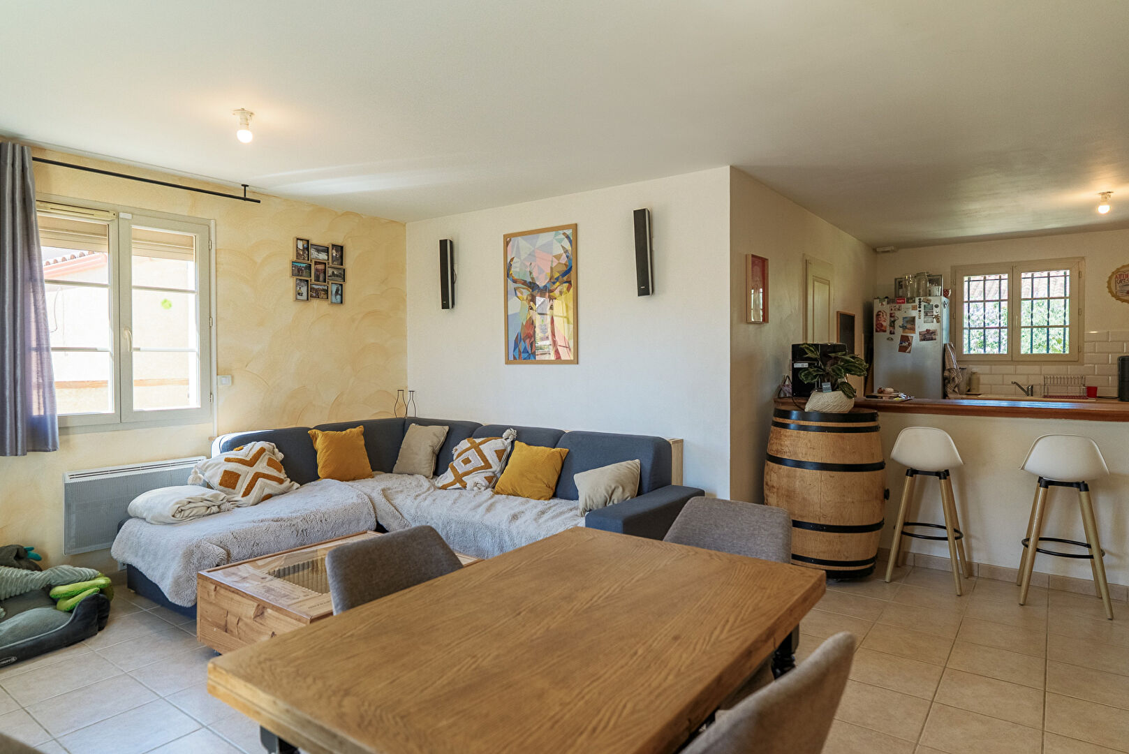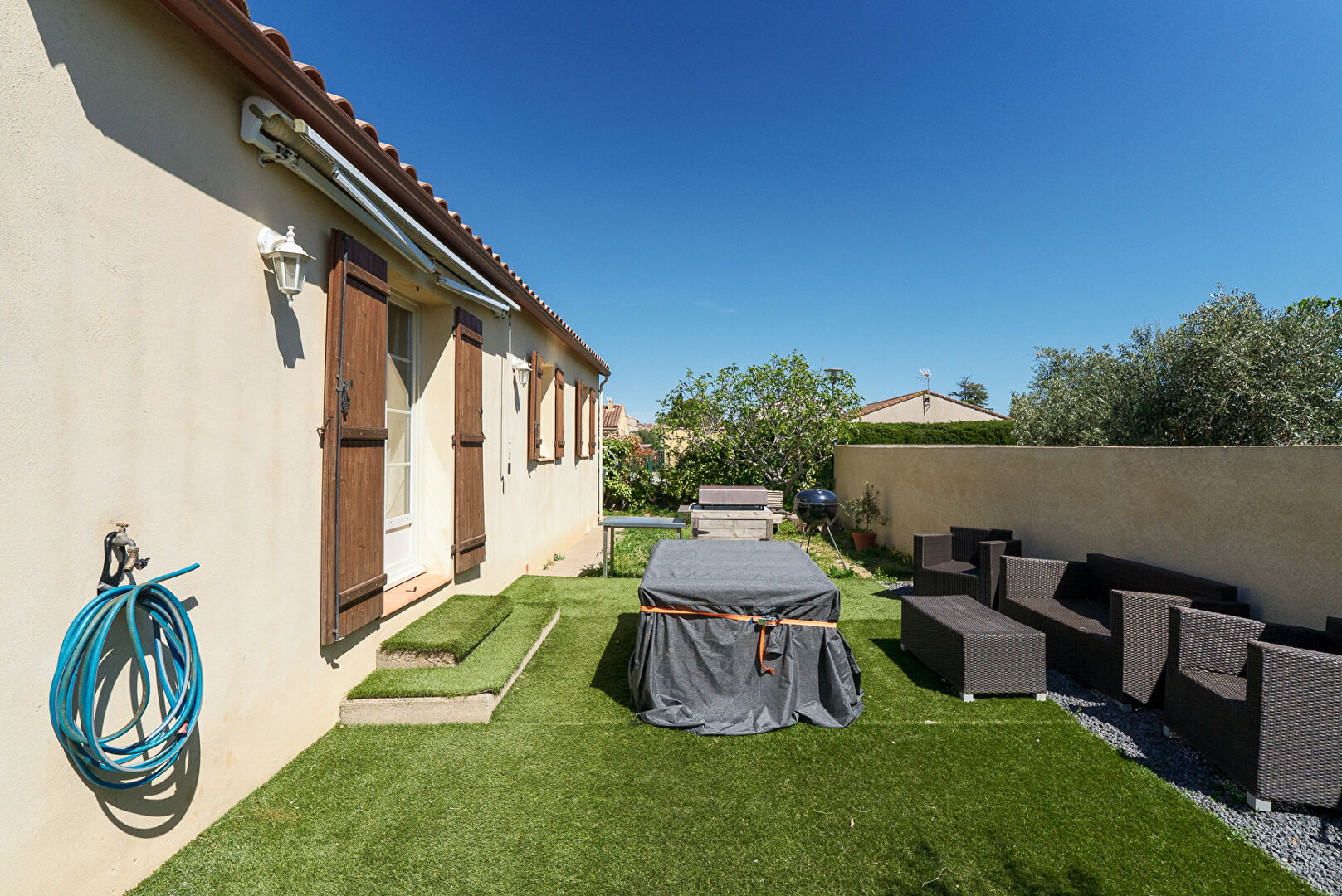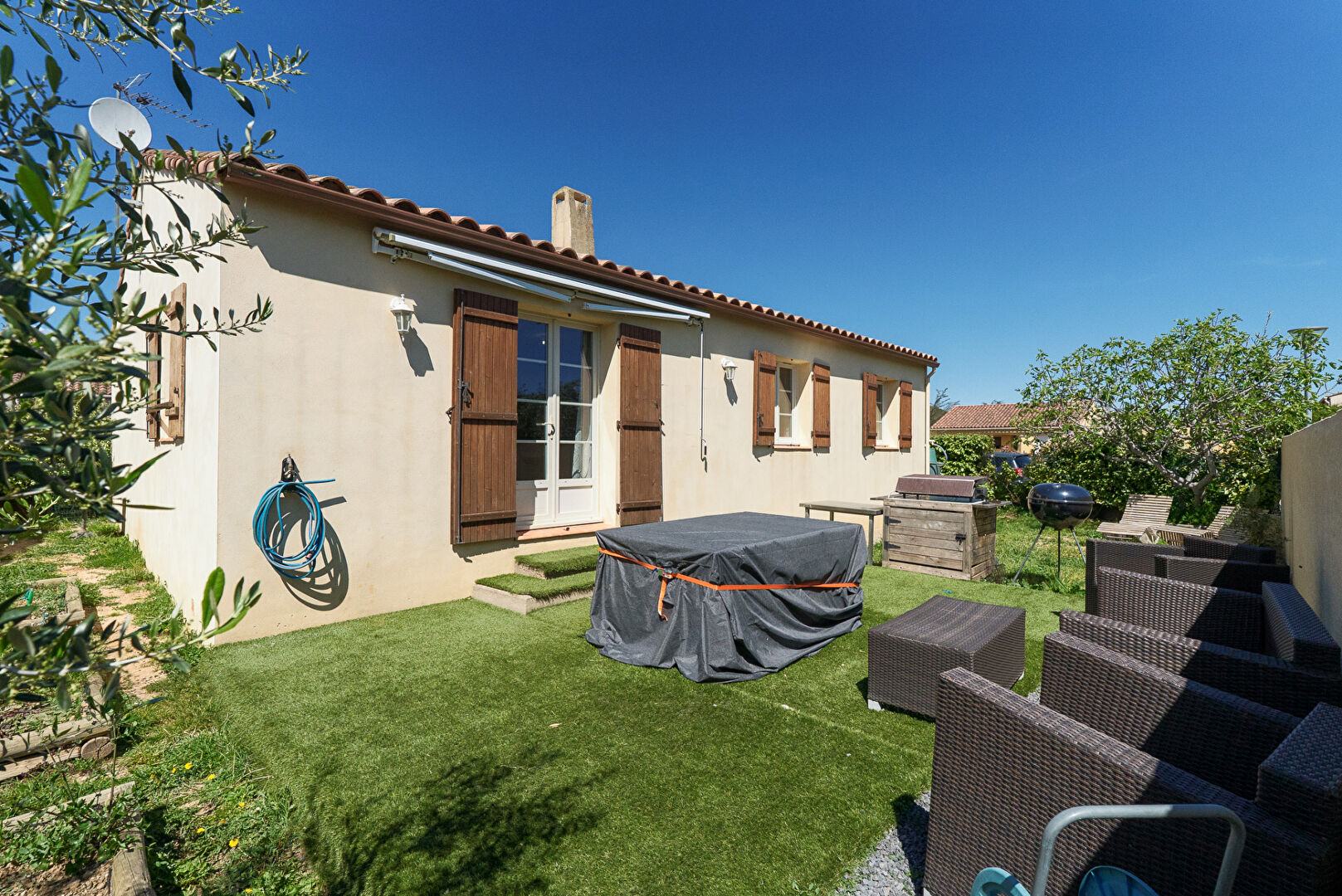 A 10 minutes de Lézignan-Corbières et à 25 minutes de Carcassonne et Narbonne, dans les faubourgs du très beau village de Fabrezan, voici une villa quatre faces avec jardin et garage. Elle développe de plain-pied quatre pièces principales et 103 m² dont 89 m² habitables. Passé le porche d’entrée, la maison s’ouvre par un hall doté de grands placards. Puis vient la pièce maîtresse, le séjour cuisine qui se déploie sur près de 26 m² . L’espace cuisine de 13,8 m² est aménagé et délimité du reste de la pièce de vie par un large comptoir façon bar. On y distingue un coin repas en face de la cuisine et un coin salon éclairé par une baie donnant sur la terrasse au sud. La cuisine permet l’accès direct au garage mitoyen lequel est équipé d’un coin buanderie. Trois chambres de 10,8 m², 12,40 m², et 13,20 m² constituent la partie nuit. Elles sont desservies par une salle de bains confortable de 7,7 m². A l’extérieur, le jardin s’enroule autour de la maison et se développe essentiellement au sud avec une grande terrasse aménagée, et au nord avec des plates bandes et une allée vers le garage. On notera également une place de stationnement privative sur le côté de la parcelle pour permettre à vos hôtes de stationner aisément. L’ensemble présente une condition harmonieuse et prête à vivre dans un cadre remarquablement préservé. Et si vous faisiez connaissance ? Renseignez-vous, contactez-nous. #3473