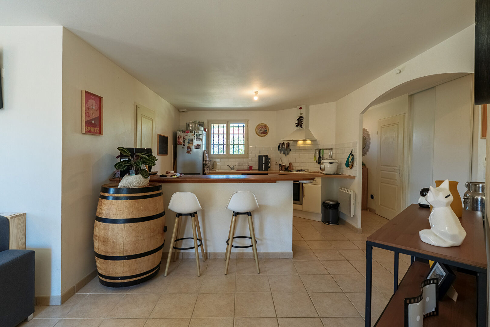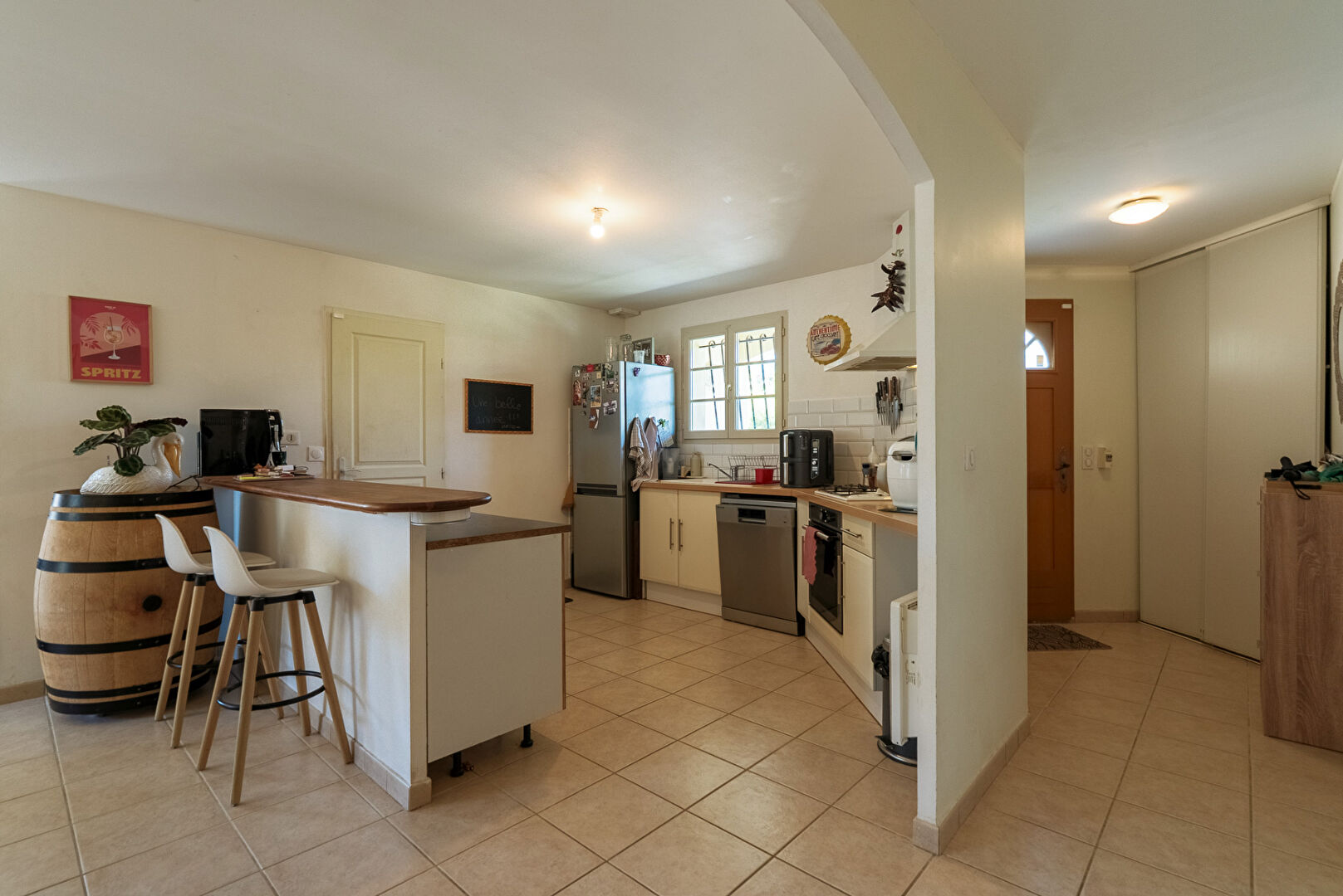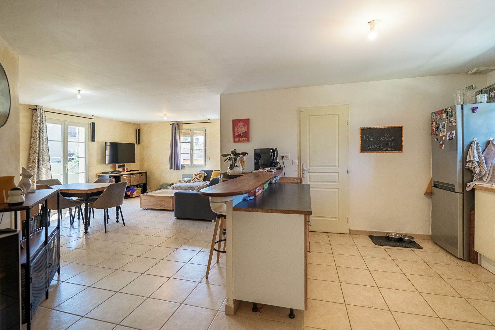A 10 minutes de Lézignan-Corbières et à 25 minutes de Carcassonne et Narbonne, dans les faubourgs du très beau village de Fabrezan, voici une villa quatre faces avec jardin et garage. Elle développe de plain-pied quatre pièces principales et 103 m² dont 89 m² habitables. Passé le porche d’entrée, la maison s’ouvre par un hall doté de grands placards. Puis vient la pièce maîtresse, le séjour cuisine qui se déploie sur près de 26 m² . L’espace cuisine de 13,8 m² est aménagé et délimité du reste de la pièce de vie par un large comptoir façon bar. On y distingue un coin repas en face de la cuisine et un coin salon éclairé par une baie donnant sur la terrasse au sud. La cuisine permet l’accès direct au garage mitoyen lequel est équipé d’un coin buanderie. Trois chambres de 10,8 m², 12,40 m², et 13,20 m² constituent la partie nuit. Elles sont desservies par une salle de bains confortable de 7,7 m². A l’extérieur, le jardin s’enroule autour de la maison et se développe essentiellement au sud avec une grande terrasse aménagée, et au nord avec des plates bandes et une allée vers le garage. On notera également une place de stationnement privative sur le côté de la parcelle pour permettre à vos hôtes de stationner aisément. L’ensemble présente une condition harmonieuse et prête à vivre dans un cadre remarquablement préservé. Et si vous faisiez connaissance ? Renseignez-vous, contactez-nous. #3473